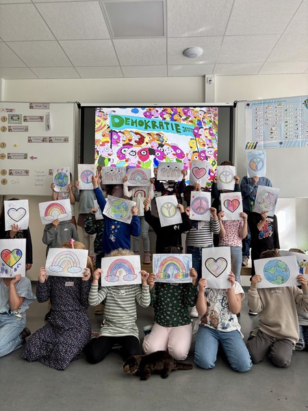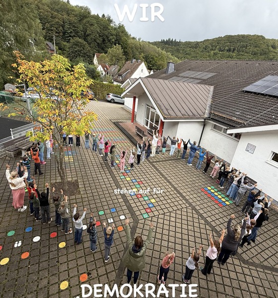 aufgestanden. Alle Schüler der drei Grundschulen sind auf Tische, Stühle und Bänke geklettert und haben ein Foto gemacht. Damit wollen sie ihre Vielfalt zeigen und ein Zeichen für die Demokratie